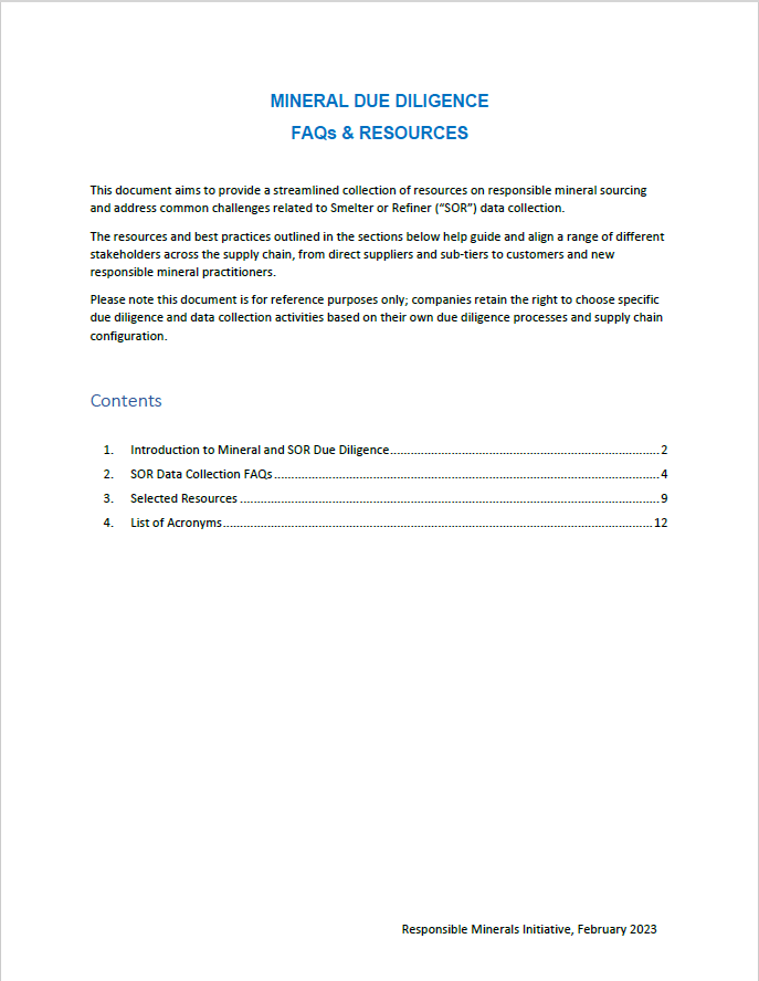 The Responsible Minerals Initiative (RMI) offers resources for companies about best practices, guidance, and standards on conducting due diligence on mineral sourcing from conflict-affected and high-risk areas, regulatory compliance, and public reporting. Many of these documents are authored by RMI members with contributions from stakeholders.